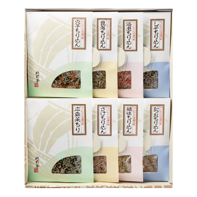 | 内容量 | さけちりめん(40g)、かつおちりめん(40g)、海老ちりめん(40g)、しそちりめん(40g)、穴子ちりめん(40g)、昆布ちりめん(40g)、鯛味ちりめん (40g)、広島菜ちりめん (40g) |