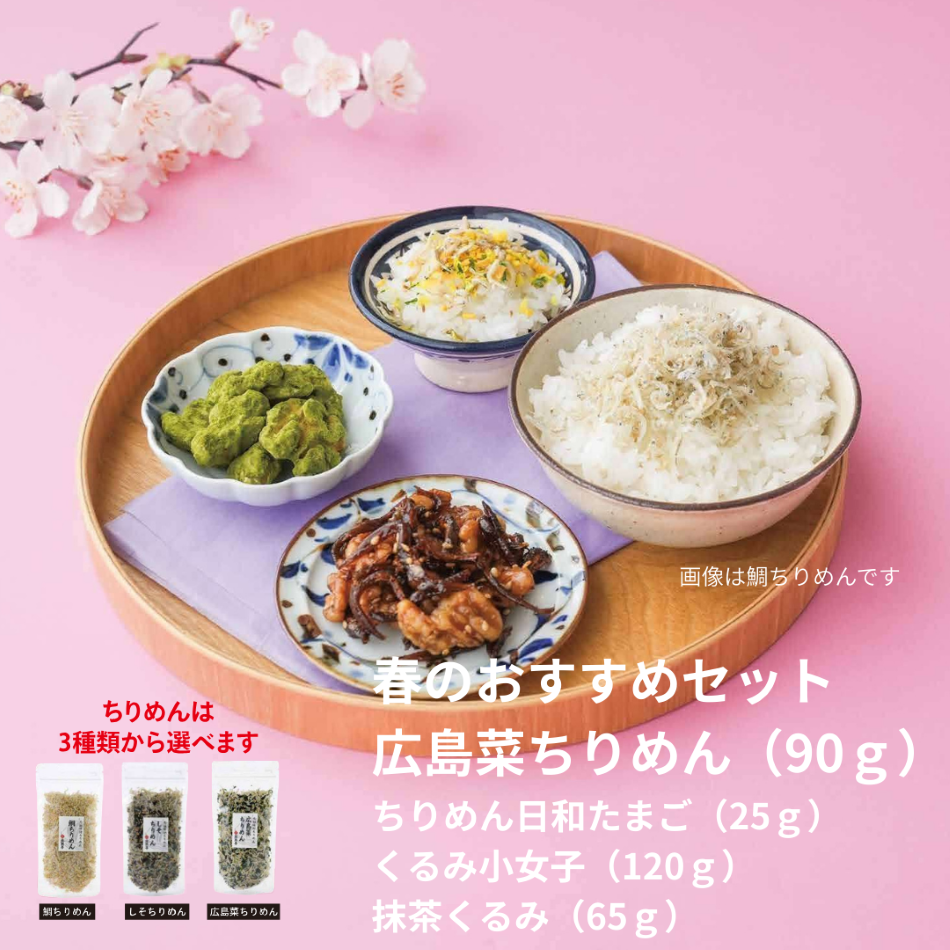 香ばしいくるみ小女子、やさしい甘さの抹茶くるみ、ふんわり食感が人気のちりめん日和たまごに加え、人気の広島菜ちりめんをご用意しました。